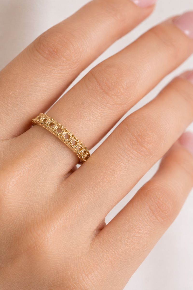A stylish gold band ring featuring a unique detailed pattern that looks elegant and trendy. Ideal for everyday use and perfect for pairing with other rings.